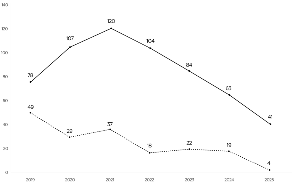 A recent empirical study published by the Russian law firm KIAP (available only in Russian) indicates that the number of applications for recognition and enforcement of foreign arbitral awards and court judgments declined significantly after February 2022. In 2021, Russian courts considered 120 such cases; by 2025, that number had fallen to 41.